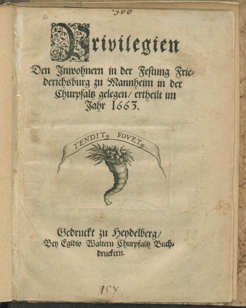 Privilegien Den Inwohnern in der Festung Friederichsburg zu Mannheim in der Churpfaltz gelegen/ ertheilt im Jahr 1663