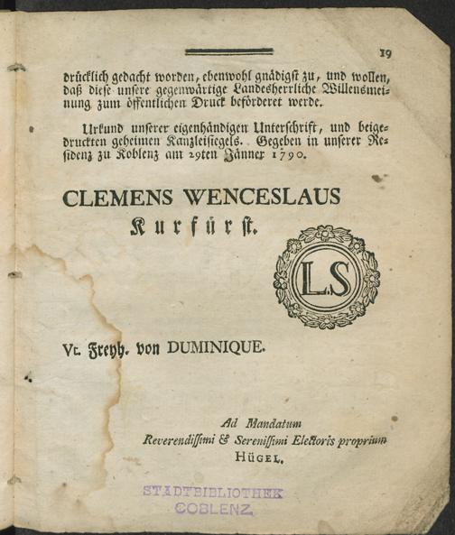 Verordnung über das Kurtrierisch-Landschaftliches Militär-Wittwen- und Waisen-Kasse-Institut : vom 29. Jänner 1790 / [Clemens Wenceslaus Kurfürst]