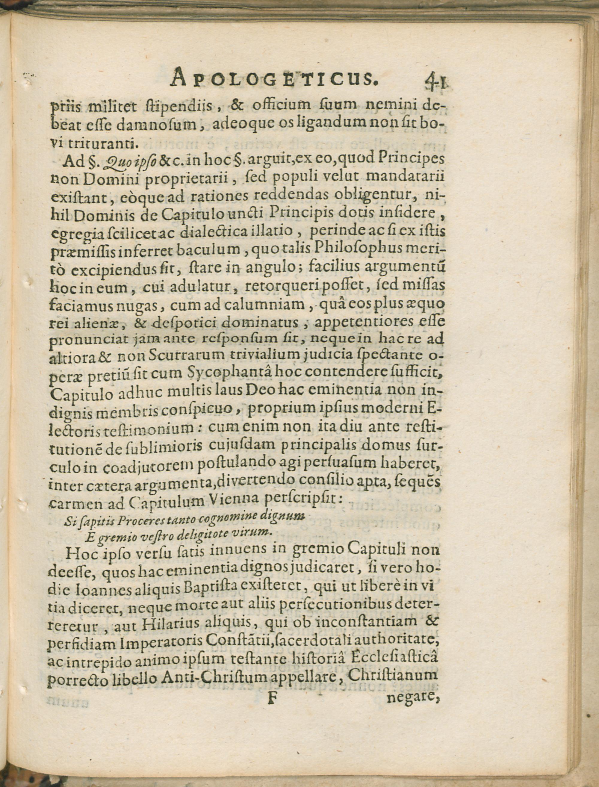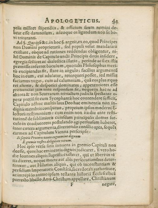 Vindex Apolegeticvs : Pro veritatis, ac innocentiae assertione, in favorem Reverendissimi & Perillustris Metropolitani Capituli Trevirensis Dominorum D. Ioannis Gvvilhelmi Hufman de Namedeji, ejusdem Capituli Praepositi, & Consortum, cuidam nuper sub Prodomi manifestandi status Trevirensis titulo, infinitis co[m]vitis, calu[m]niis, &, mendaciis scatenti, famoso libello auctore quodam Mysadelpho epoptâ, cui inde collo per canabina[m] fenestram inserto proprio epopseos suo perspicillio meritò videndum sit, typis vulgato oppositus / Per Apollinarem Veridicum