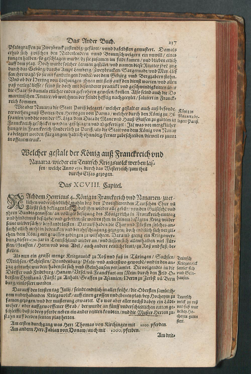 CHRONICON ALSATIAE.|| Edelsasser Cronick || vnnd außf[ue]rliche beschrei=||bung des vntern Elsasses am Rhein=||strom/ auch desselben f[ue]rnem̃er St[ae]tt/ als Straßburg/ Schlet=||statt/ Hagenaw/ Weissenburg/ vnd anderer der enden gelegener St[ae]tt/ Schl[oe]s=||ser/ Cl[oe]ster/ Stifft/ M[ae]rckt/ Flecken vnd D[oe]rffer. Als auch der Landgraffschafft/ vñ Bisthumbs Straßburg gehabter || Landgraffen/ Bischoffen/ sampt ermeldten Lands Fürstenthumben/ Graff vnd Herrschafften/ Adenlicher/|| vnd Burgerlicher Geschlechter/ jhrer Genealogien/ St[ae]mmen/ geburts Linien/|| Wappen vnd Cleinodien.|| Darinn jhre her vnd ankunfften/ leben/ handlung/ thaten/ auch darinnẽ von an=||fang dessen biß auff gegenwertiges 1592. Jar gedenckw[ue]rdigen vorgangene geschichten ... || beschrieben/ vnd ... || an tag gegeben worden.|| Durch ... Herrn Bernhart Hertzogen/ dieser zeit Hanaw Liechten=||bergischen Amptmann zu W[oe]rdt.||