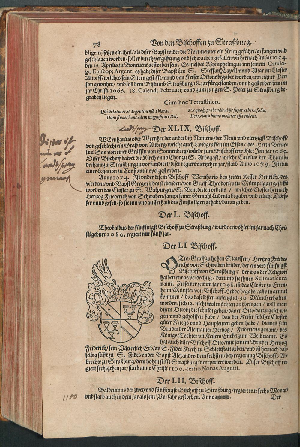 CHRONICON ALSATIAE.|| Edelsasser Cronick || vnnd außf[ue]rliche beschrei=||bung des vntern Elsasses am Rhein=||strom/ auch desselben f[ue]rnem̃er St[ae]tt/ als Straßburg/ Schlet=||statt/ Hagenaw/ Weissenburg/ vnd anderer der enden gelegener St[ae]tt/ Schl[oe]s=||ser/ Cl[oe]ster/ Stifft/ M[ae]rckt/ Flecken vnd D[oe]rffer. Als auch der Landgraffschafft/ vñ Bisthumbs Straßburg gehabter || Landgraffen/ Bischoffen/ sampt ermeldten Lands Fürstenthumben/ Graff vnd Herrschafften/ Adenlicher/|| vnd Burgerlicher Geschlechter/ jhrer Genealogien/ St[ae]mmen/ geburts Linien/|| Wappen vnd Cleinodien.|| Darinn jhre her vnd ankunfften/ leben/ handlung/ thaten/ auch darinnẽ von an=||fang dessen biß auff gegenwertiges 1592. Jar gedenckw[ue]rdigen vorgangene geschichten ... || beschrieben/ vnd ... || an tag gegeben worden.|| Durch ... Herrn Bernhart Hertzogen/ dieser zeit Hanaw Liechten=||bergischen Amptmann zu W[oe]rdt.||