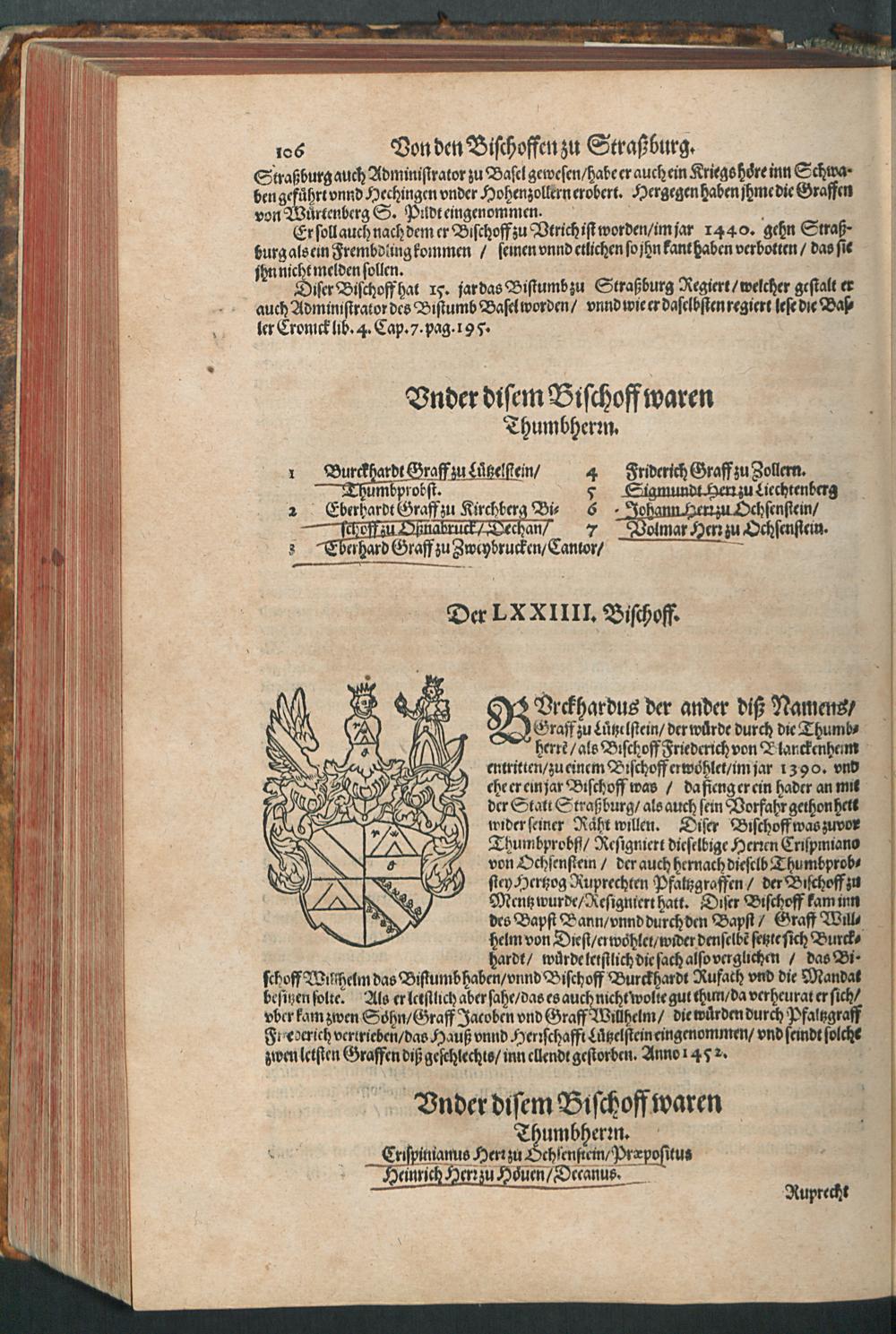 CHRONICON ALSATIAE.|| Edelsasser Cronick || vnnd außf[ue]rliche beschrei=||bung des vntern Elsasses am Rhein=||strom/ auch desselben f[ue]rnem̃er St[ae]tt/ als Straßburg/ Schlet=||statt/ Hagenaw/ Weissenburg/ vnd anderer der enden gelegener St[ae]tt/ Schl[oe]s=||ser/ Cl[oe]ster/ Stifft/ M[ae]rckt/ Flecken vnd D[oe]rffer. Als auch der Landgraffschafft/ vñ Bisthumbs Straßburg gehabter || Landgraffen/ Bischoffen/ sampt ermeldten Lands Fürstenthumben/ Graff vnd Herrschafften/ Adenlicher/|| vnd Burgerlicher Geschlechter/ jhrer Genealogien/ St[ae]mmen/ geburts Linien/|| Wappen vnd Cleinodien.|| Darinn jhre her vnd ankunfften/ leben/ handlung/ thaten/ auch darinnẽ von an=||fang dessen biß auff gegenwertiges 1592. Jar gedenckw[ue]rdigen vorgangene geschichten ... || beschrieben/ vnd ... || an tag gegeben worden.|| Durch ... Herrn Bernhart Hertzogen/ dieser zeit Hanaw Liechten=||bergischen Amptmann zu W[oe]rdt.||