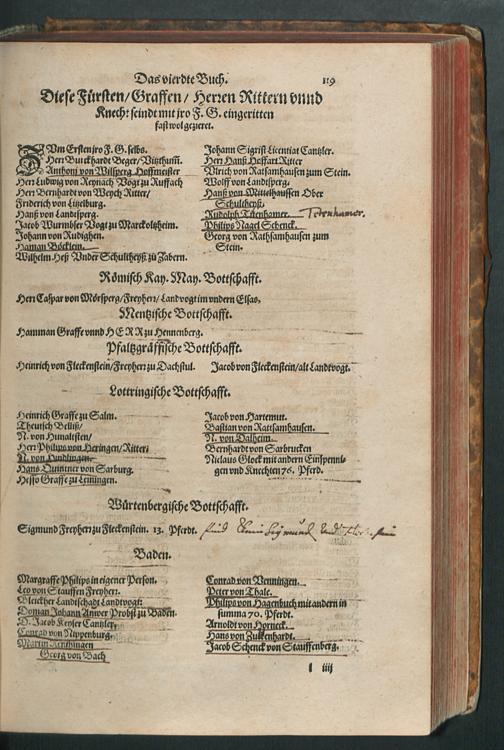 CHRONICON ALSATIAE.|| Edelsasser Cronick || vnnd außf[ue]rliche beschrei=||bung des vntern Elsasses am Rhein=||strom/ auch desselben f[ue]rnem̃er St[ae]tt/ als Straßburg/ Schlet=||statt/ Hagenaw/ Weissenburg/ vnd anderer der enden gelegener St[ae]tt/ Schl[oe]s=||ser/ Cl[oe]ster/ Stifft/ M[ae]rckt/ Flecken vnd D[oe]rffer. Als auch der Landgraffschafft/ vñ Bisthumbs Straßburg gehabter || Landgraffen/ Bischoffen/ sampt ermeldten Lands Fürstenthumben/ Graff vnd Herrschafften/ Adenlicher/|| vnd Burgerlicher Geschlechter/ jhrer Genealogien/ St[ae]mmen/ geburts Linien/|| Wappen vnd Cleinodien.|| Darinn jhre her vnd ankunfften/ leben/ handlung/ thaten/ auch darinnẽ von an=||fang dessen biß auff gegenwertiges 1592. Jar gedenckw[ue]rdigen vorgangene geschichten ... || beschrieben/ vnd ... || an tag gegeben worden.|| Durch ... Herrn Bernhart Hertzogen/ dieser zeit Hanaw Liechten=||bergischen Amptmann zu W[oe]rdt.||