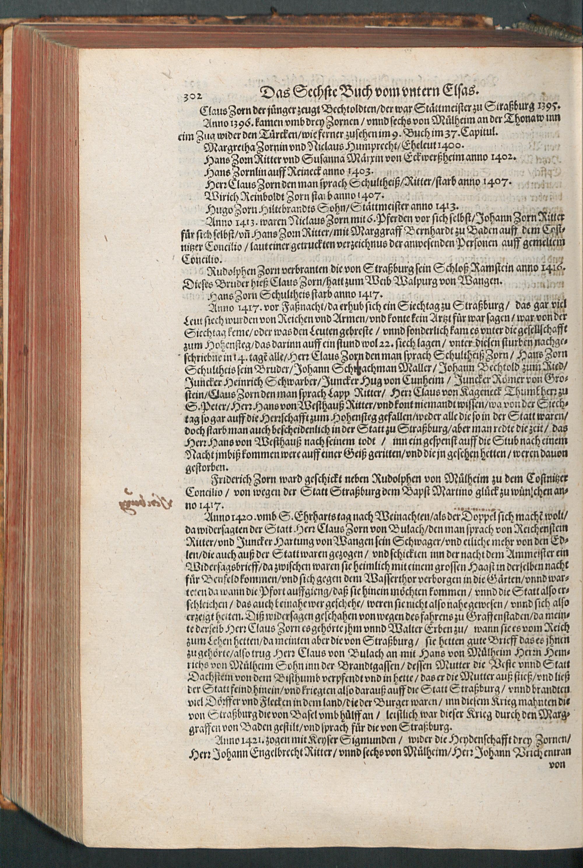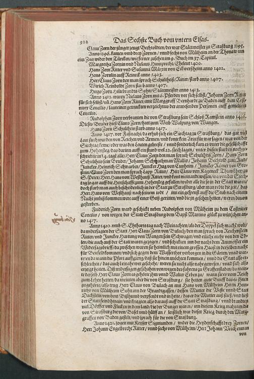 CHRONICON ALSATIAE.|| Edelsasser Cronick || vnnd außf[ue]rliche beschrei=||bung des vntern Elsasses am Rhein=||strom/ auch desselben f[ue]rnem̃er St[ae]tt/ als Straßburg/ Schlet=||statt/ Hagenaw/ Weissenburg/ vnd anderer der enden gelegener St[ae]tt/ Schl[oe]s=||ser/ Cl[oe]ster/ Stifft/ M[ae]rckt/ Flecken vnd D[oe]rffer. Als auch der Landgraffschafft/ vñ Bisthumbs Straßburg gehabter || Landgraffen/ Bischoffen/ sampt ermeldten Lands Fürstenthumben/ Graff vnd Herrschafften/ Adenlicher/|| vnd Burgerlicher Geschlechter/ jhrer Genealogien/ St[ae]mmen/ geburts Linien/|| Wappen vnd Cleinodien.|| Darinn jhre her vnd ankunfften/ leben/ handlung/ thaten/ auch darinnẽ von an=||fang dessen biß auff gegenwertiges 1592. Jar gedenckw[ue]rdigen vorgangene geschichten ... || beschrieben/ vnd ... || an tag gegeben worden.|| Durch ... Herrn Bernhart Hertzogen/ dieser zeit Hanaw Liechten=||bergischen Amptmann zu W[oe]rdt.||