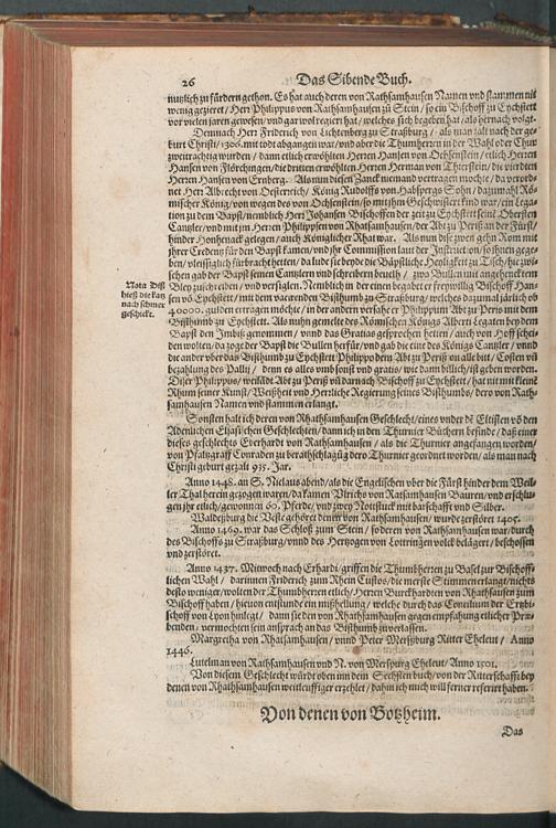 CHRONICON ALSATIAE.|| Edelsasser Cronick || vnnd außf[ue]rliche beschrei=||bung des vntern Elsasses am Rhein=||strom/ auch desselben f[ue]rnem̃er St[ae]tt/ als Straßburg/ Schlet=||statt/ Hagenaw/ Weissenburg/ vnd anderer der enden gelegener St[ae]tt/ Schl[oe]s=||ser/ Cl[oe]ster/ Stifft/ M[ae]rckt/ Flecken vnd D[oe]rffer. Als auch der Landgraffschafft/ vñ Bisthumbs Straßburg gehabter || Landgraffen/ Bischoffen/ sampt ermeldten Lands Fürstenthumben/ Graff vnd Herrschafften/ Adenlicher/|| vnd Burgerlicher Geschlechter/ jhrer Genealogien/ St[ae]mmen/ geburts Linien/|| Wappen vnd Cleinodien.|| Darinn jhre her vnd ankunfften/ leben/ handlung/ thaten/ auch darinnẽ von an=||fang dessen biß auff gegenwertiges 1592. Jar gedenckw[ue]rdigen vorgangene geschichten ... || beschrieben/ vnd ... || an tag gegeben worden.|| Durch ... Herrn Bernhart Hertzogen/ dieser zeit Hanaw Liechten=||bergischen Amptmann zu W[oe]rdt.||