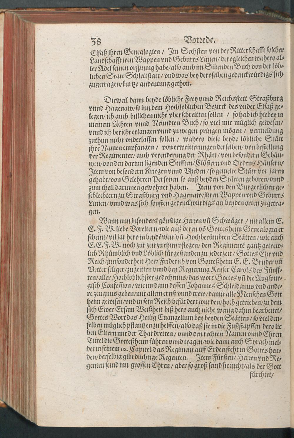 CHRONICON ALSATIAE.|| Edelsasser Cronick || vnnd außf[ue]rliche beschrei=||bung des vntern Elsasses am Rhein=||strom/ auch desselben f[ue]rnem̃er St[ae]tt/ als Straßburg/ Schlet=||statt/ Hagenaw/ Weissenburg/ vnd anderer der enden gelegener St[ae]tt/ Schl[oe]s=||ser/ Cl[oe]ster/ Stifft/ M[ae]rckt/ Flecken vnd D[oe]rffer. Als auch der Landgraffschafft/ vñ Bisthumbs Straßburg gehabter || Landgraffen/ Bischoffen/ sampt ermeldten Lands Fürstenthumben/ Graff vnd Herrschafften/ Adenlicher/|| vnd Burgerlicher Geschlechter/ jhrer Genealogien/ St[ae]mmen/ geburts Linien/|| Wappen vnd Cleinodien.|| Darinn jhre her vnd ankunfften/ leben/ handlung/ thaten/ auch darinnẽ von an=||fang dessen biß auff gegenwertiges 1592. Jar gedenckw[ue]rdigen vorgangene geschichten ... || beschrieben/ vnd ... || an tag gegeben worden.|| Durch ... Herrn Bernhart Hertzogen/ dieser zeit Hanaw Liechten=||bergischen Amptmann zu W[oe]rdt.||