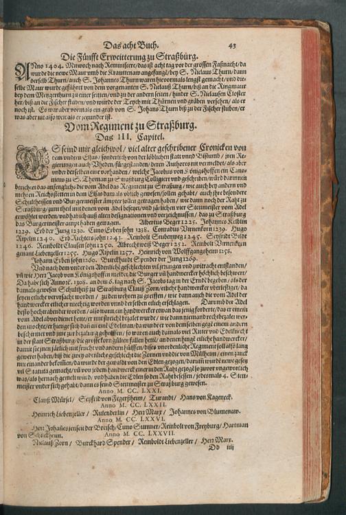 CHRONICON ALSATIAE.|| Edelsasser Cronick || vnnd außf[ue]rliche beschrei=||bung des vntern Elsasses am Rhein=||strom/ auch desselben f[ue]rnem̃er St[ae]tt/ als Straßburg/ Schlet=||statt/ Hagenaw/ Weissenburg/ vnd anderer der enden gelegener St[ae]tt/ Schl[oe]s=||ser/ Cl[oe]ster/ Stifft/ M[ae]rckt/ Flecken vnd D[oe]rffer. Als auch der Landgraffschafft/ vñ Bisthumbs Straßburg gehabter || Landgraffen/ Bischoffen/ sampt ermeldten Lands Fürstenthumben/ Graff vnd Herrschafften/ Adenlicher/|| vnd Burgerlicher Geschlechter/ jhrer Genealogien/ St[ae]mmen/ geburts Linien/|| Wappen vnd Cleinodien.|| Darinn jhre her vnd ankunfften/ leben/ handlung/ thaten/ auch darinnẽ von an=||fang dessen biß auff gegenwertiges 1592. Jar gedenckw[ue]rdigen vorgangene geschichten ... || beschrieben/ vnd ... || an tag gegeben worden.|| Durch ... Herrn Bernhart Hertzogen/ dieser zeit Hanaw Liechten=||bergischen Amptmann zu W[oe]rdt.||