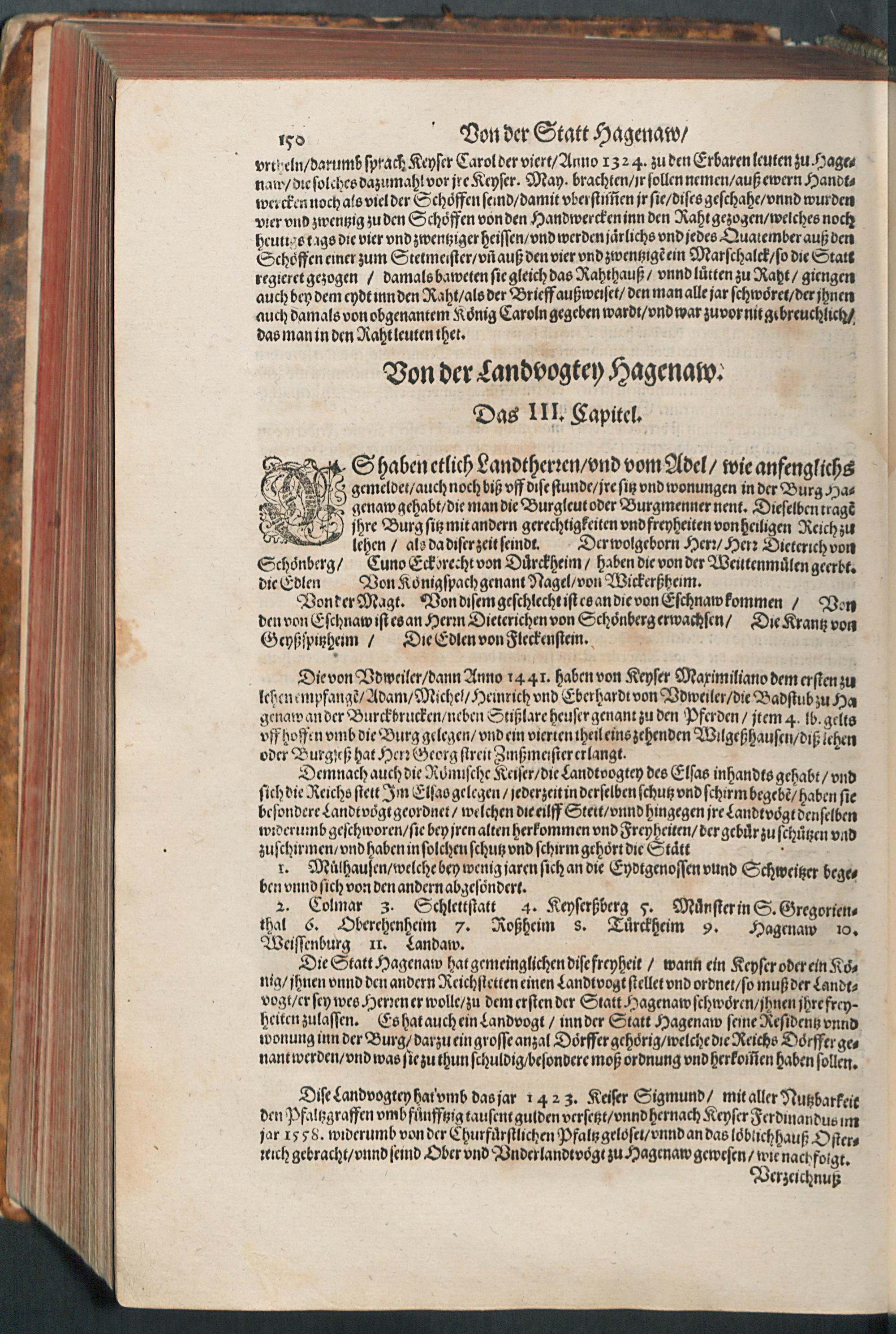 CHRONICON ALSATIAE.|| Edelsasser Cronick || vnnd außf[ue]rliche beschrei=||bung des vntern Elsasses am Rhein=||strom/ auch desselben f[ue]rnem̃er St[ae]tt/ als Straßburg/ Schlet=||statt/ Hagenaw/ Weissenburg/ vnd anderer der enden gelegener St[ae]tt/ Schl[oe]s=||ser/ Cl[oe]ster/ Stifft/ M[ae]rckt/ Flecken vnd D[oe]rffer. Als auch der Landgraffschafft/ vñ Bisthumbs Straßburg gehabter || Landgraffen/ Bischoffen/ sampt ermeldten Lands Fürstenthumben/ Graff vnd Herrschafften/ Adenlicher/|| vnd Burgerlicher Geschlechter/ jhrer Genealogien/ St[ae]mmen/ geburts Linien/|| Wappen vnd Cleinodien.|| Darinn jhre her vnd ankunfften/ leben/ handlung/ thaten/ auch darinnẽ von an=||fang dessen biß auff gegenwertiges 1592. Jar gedenckw[ue]rdigen vorgangene geschichten ... || beschrieben/ vnd ... || an tag gegeben worden.|| Durch ... Herrn Bernhart Hertzogen/ dieser zeit Hanaw Liechten=||bergischen Amptmann zu W[oe]rdt.||