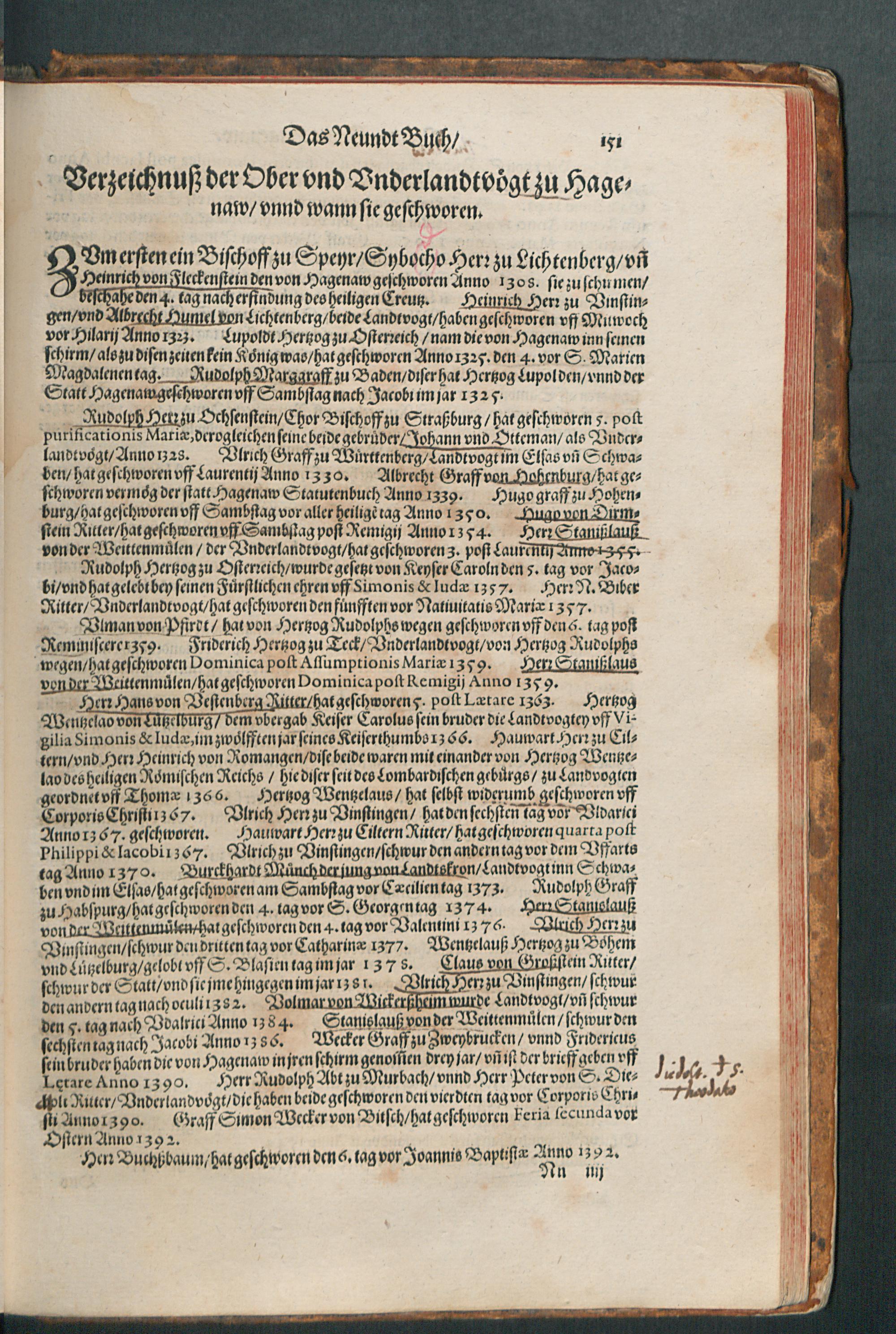 CHRONICON ALSATIAE.|| Edelsasser Cronick || vnnd außf[ue]rliche beschrei=||bung des vntern Elsasses am Rhein=||strom/ auch desselben f[ue]rnem̃er St[ae]tt/ als Straßburg/ Schlet=||statt/ Hagenaw/ Weissenburg/ vnd anderer der enden gelegener St[ae]tt/ Schl[oe]s=||ser/ Cl[oe]ster/ Stifft/ M[ae]rckt/ Flecken vnd D[oe]rffer. Als auch der Landgraffschafft/ vñ Bisthumbs Straßburg gehabter || Landgraffen/ Bischoffen/ sampt ermeldten Lands Fürstenthumben/ Graff vnd Herrschafften/ Adenlicher/|| vnd Burgerlicher Geschlechter/ jhrer Genealogien/ St[ae]mmen/ geburts Linien/|| Wappen vnd Cleinodien.|| Darinn jhre her vnd ankunfften/ leben/ handlung/ thaten/ auch darinnẽ von an=||fang dessen biß auff gegenwertiges 1592. Jar gedenckw[ue]rdigen vorgangene geschichten ... || beschrieben/ vnd ... || an tag gegeben worden.|| Durch ... Herrn Bernhart Hertzogen/ dieser zeit Hanaw Liechten=||bergischen Amptmann zu W[oe]rdt.||