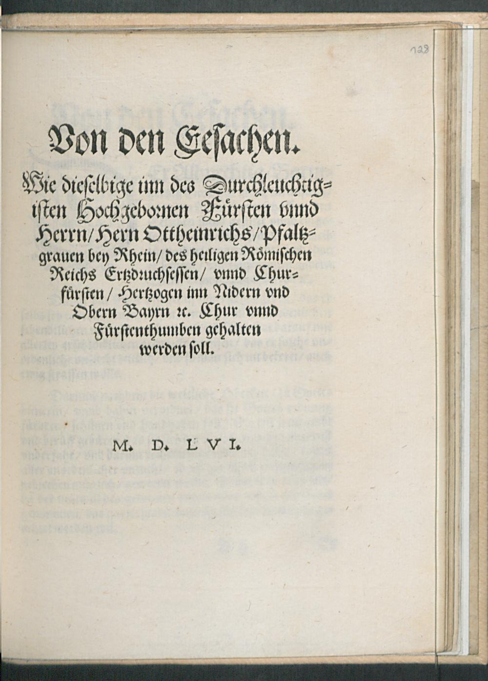Von den Eesachen.|| Wie dieselbige inn des Durchleuchtig=||isten Hochgebornen F[ue]rsten vnnd || Herrn/ Hern Ottheinrichs/ Pfaltz=||grauen bey Rhein/ des heiligen R[oe]mischen || Reichs Ertzdruchsessen/ vnnd Chur=||f[ue]rsten/ Hertzogen inn Nidern vnd || Obern Bayrn [et]c. Chur vnnd || F[ue]rstenthumben gehalten || werden soll.||