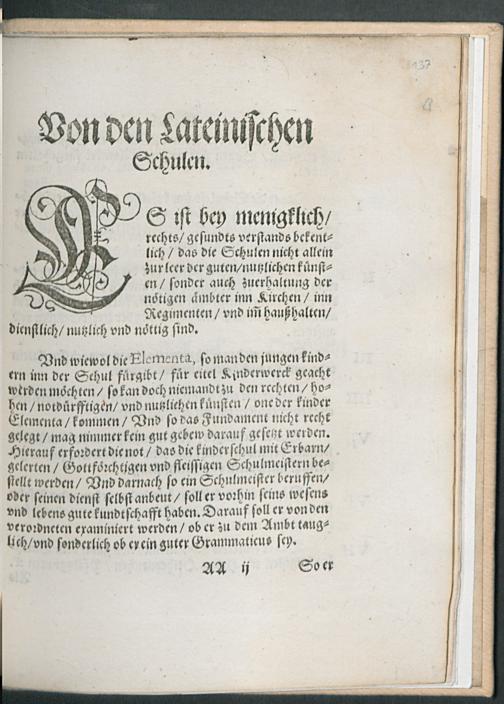 Schul Ordnung.|| Wie dieselbige inn des Durchleuchtig=||isten Hochgebornen F[ue]rsten vnnd || Herrn/ Hern Ottheinrichs/ Pfaltz=||grauen bey Rhein/ des heiligen R[oe]mischen || Reichs Ertzdruchsessen/ vnnd Chur=||f[ue]rsten/ Hertzogen inn Nidern vnd || Obern Bayrn [et]c. Chur vnnd || F[ue]rstenthumben gehalten || werden soll.||