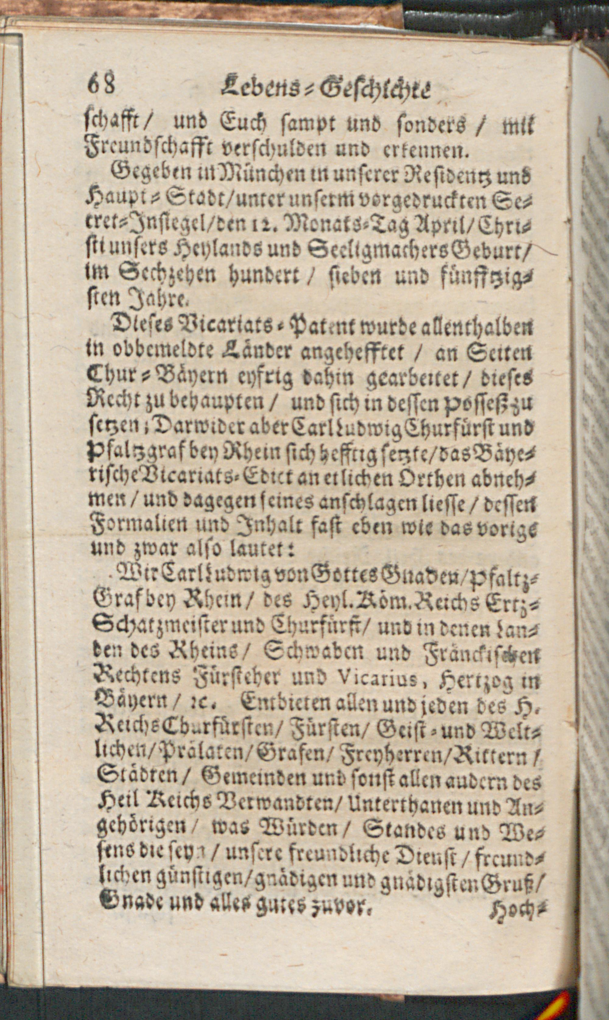 Lebens-Geschichte/ Der Weyland Durchleuchtigsten Churfürsten in der Pfaltz/ Friederich des V. Carl Ludwigs/ und Carls : Worinnen Die Böhmische Unruhe/ der Dreyssig-jährige Krieg/ die Vicariat- und Wildfangs-Sache/ des Chur-Fürsten Carl Ludwig Liebes-Händel mit der Baronessin von Degenfeld/ und die Langhänsische Sache Durch einen gantz kurtzen Begriff annehmlich beschrieben werden / [Immanuel Weber]