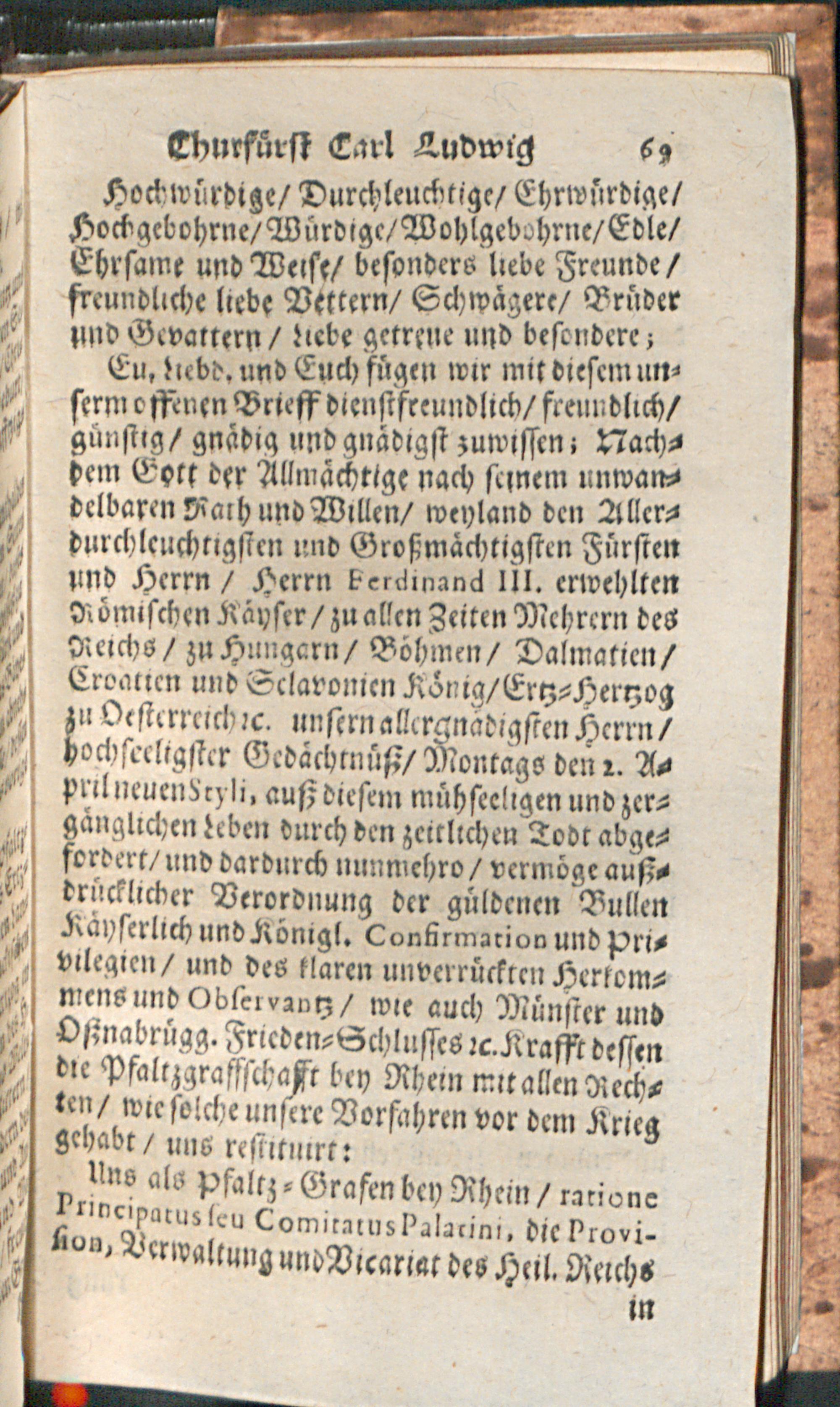 Lebens-Geschichte/ Der Weyland Durchleuchtigsten Churfürsten in der Pfaltz/ Friederich des V. Carl Ludwigs/ und Carls : Worinnen Die Böhmische Unruhe/ der Dreyssig-jährige Krieg/ die Vicariat- und Wildfangs-Sache/ des Chur-Fürsten Carl Ludwig Liebes-Händel mit der Baronessin von Degenfeld/ und die Langhänsische Sache Durch einen gantz kurtzen Begriff annehmlich beschrieben werden / [Immanuel Weber]