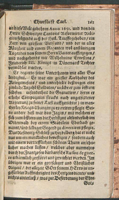 Lebens-Geschichte/ Der Weyland Durchleuchtigsten Churfürsten in der Pfaltz/ Friederich des V. Carl Ludwigs/ und Carls : Worinnen Die Böhmische Unruhe/ der Dreyssig-jährige Krieg/ die Vicariat- und Wildfangs-Sache/ des Chur-Fürsten Carl Ludwig Liebes-Händel mit der Baronessin von Degenfeld/ und die Langhänsische Sache Durch einen gantz kurtzen Begriff annehmlich beschrieben werden / [Immanuel Weber]