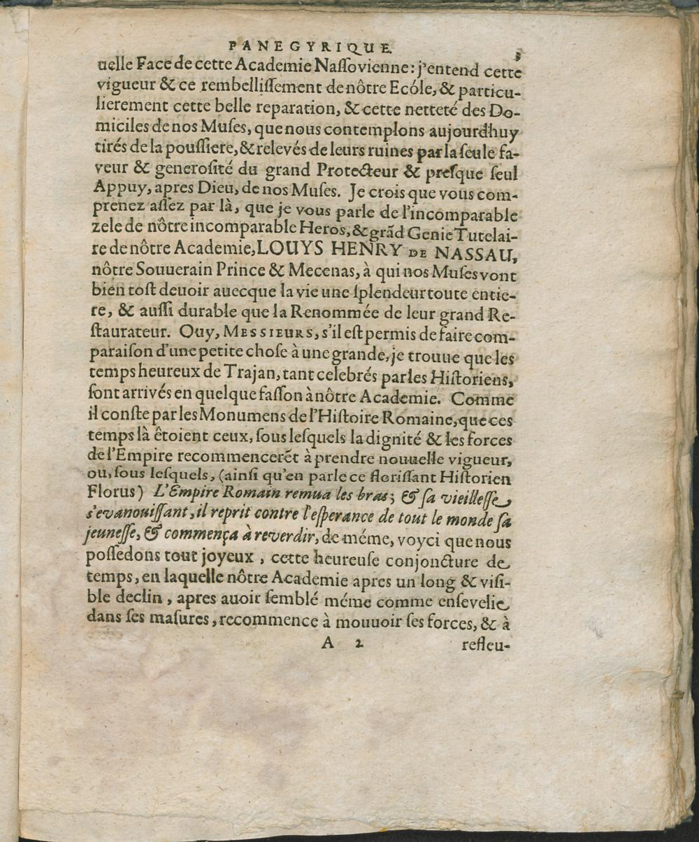 Louys Henry de Nassau. Panégyrique, traduit d'une pièce latine composée & récitée par J. M. Steinberg l'An MDCLIX ... entrant en Charge de Recteur ...pour témoigner en une Occasion récente & particulière, des Actions de graces solennelles à ce grand Protecteur, & généreux Restaurateur de l'Académie Nassovienne.