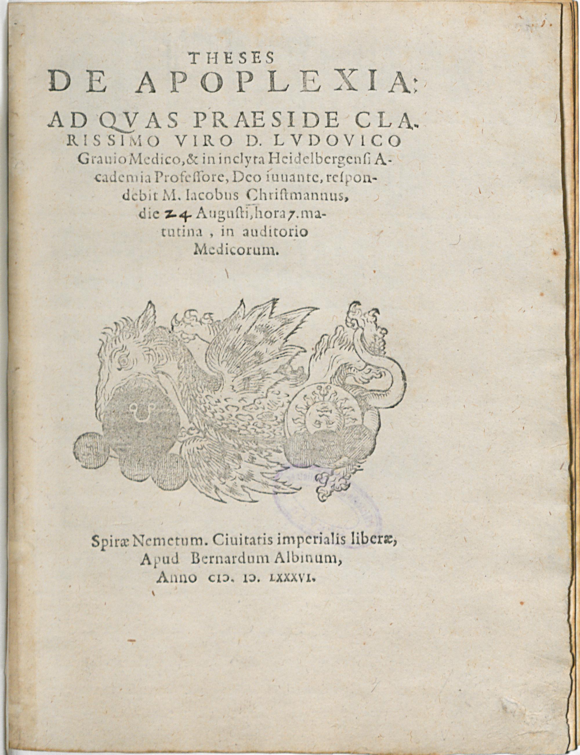 THESES || DE APOPLEXIA:|| AD QVAS PRAESIDE CLA-||RISSIMO VIRO D. LVDOVICO || Grauio Medico, & in inclyta Heidelbergensi A-||cademia Professore, Deo iuuante, respon-||debit M. Iacobus Christmannus,|| die [...] Augusti, hora 7. ma-||tutina, in auditorio || Medicorum.||