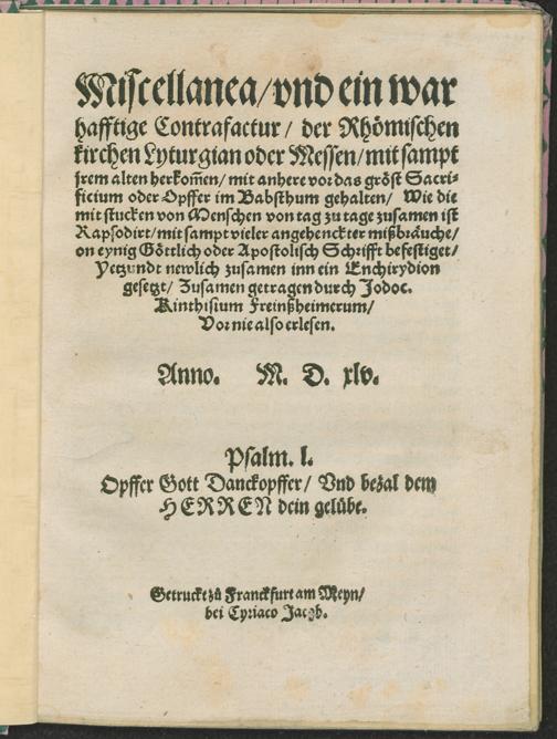 Miscellanea/ vnd ein war||hafftige Contrafactur/ der Rhömischen || kirchen Lyturgian oder Messen/ mit sampt || jrem alten herkom[m]en/ mit anhere vor das gröst Sacri=||ficium oder Opffer im Babsthum gehalten ... || Zusamen getragen durch Jodoc.|| Kinthisium Freinßheimerum/|| Vor nie also erlesen.||
