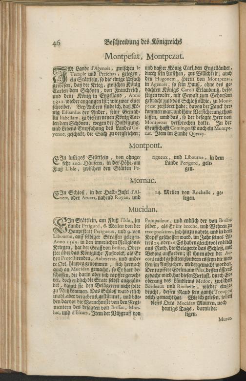 Die fürnehmste und bekannteste Städte und Plätze in Guienne, Guascoigne, Saintonge, Bearn, und andern herumbligenden/ als/ Perigord, l'Agenois, &c. Abhandlend und fürgestellt