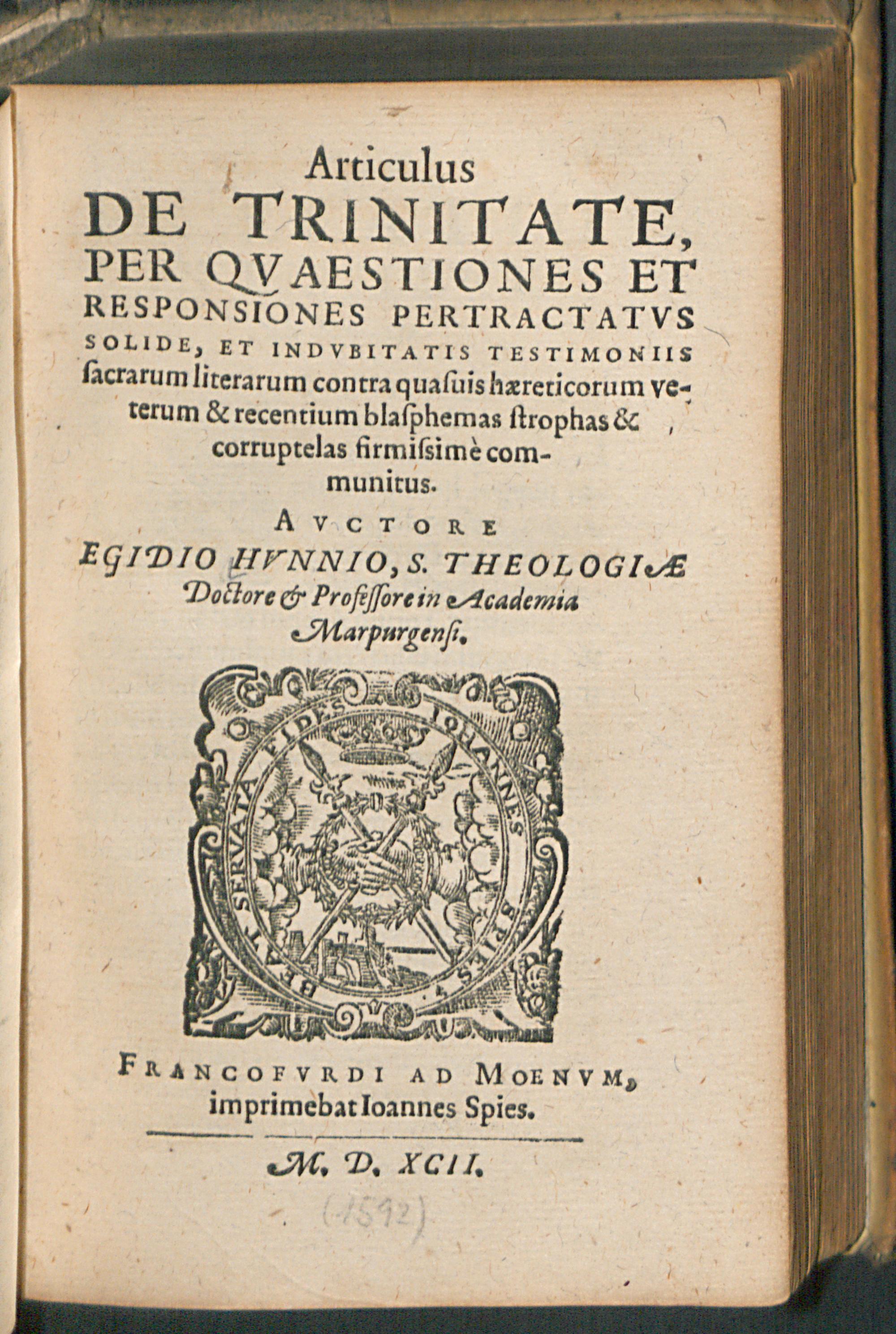 Articulus || DE TRINITATE,|| PER QVAESTIONES ET || RESPONSIONES PERTRACTATVS || SOLIDE, ET INDVBITATIS TESTIMONIIS || sacrarum literarum contra quasuis haereticorum ve-||terum & recentium blasphemas strophas & || corruptelas firmissimè com-||munitus.|| / AVCTORE || EGIDIO HVNNIO, S. THEOLOGIAE || Doctore et Professore in Academia || Marpurgensi.||