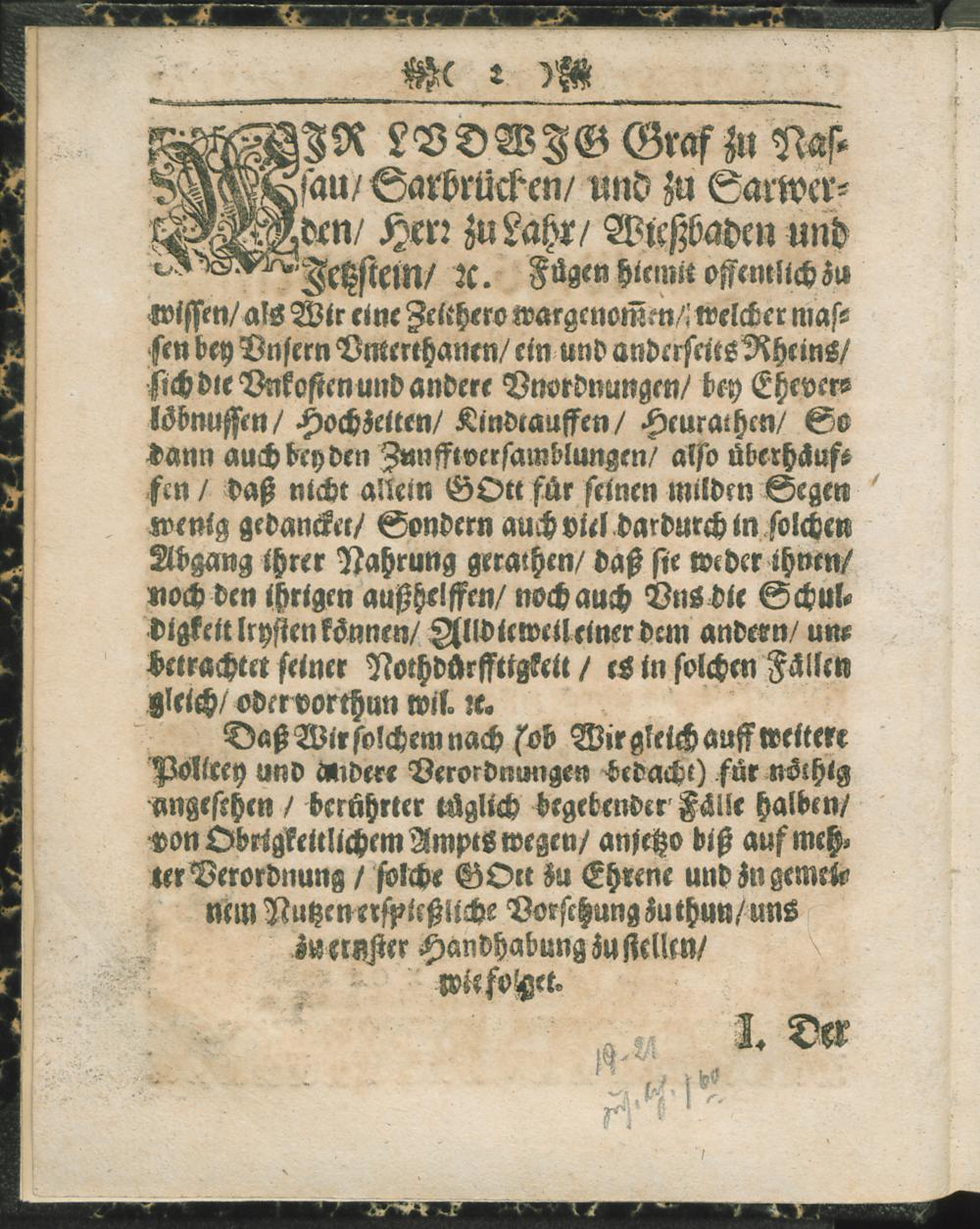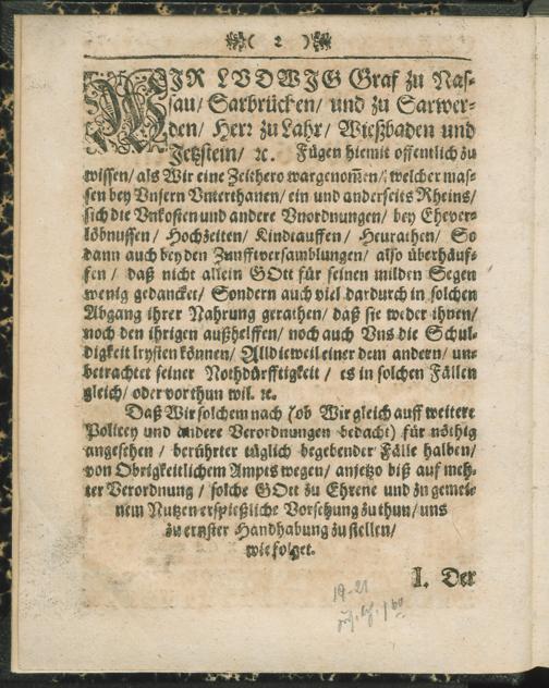 Ordnung/ Wie es in Unser Ludwigs Graffen zu Nassau ... Graffe und Herrschafften hinführo/ bey Ehe-Verlöbnussen/ Hochzeiten/ Kindtauffen/ und Leichbegängnussen/ [et]c. Mit Abstellung allerhand Unordnung/ und überflüssiger Unkosten sol gehalten werden