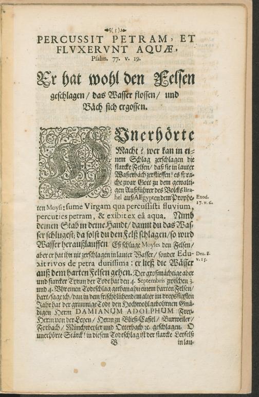 Bittere Wässer So geflossen auß dem Leyfelsen Oder Traurige Leich-Predig Uber den schmertzlichen unverhofften Todtfall deß Hochwohlgebohrnen und Gnädigen Herren ... Damiani Adolphi Frey Herrn von der Leyen ... welchen der unersädtlichen Lebens-Mörder den 4. Septembris ... in Cöllen seines grünblühenten Alters im 30. Jahr auff dem Leyischen Felsen geschlagen ... : Vorgetragen In der Hochansehnlicher Trawer ... in der Kirchen Fratrum Min: Recollect. zu Coblentz den 21. Tag Octobris, im Jahr Christi 1687 / Durch Fratrem Franciscum Maiier