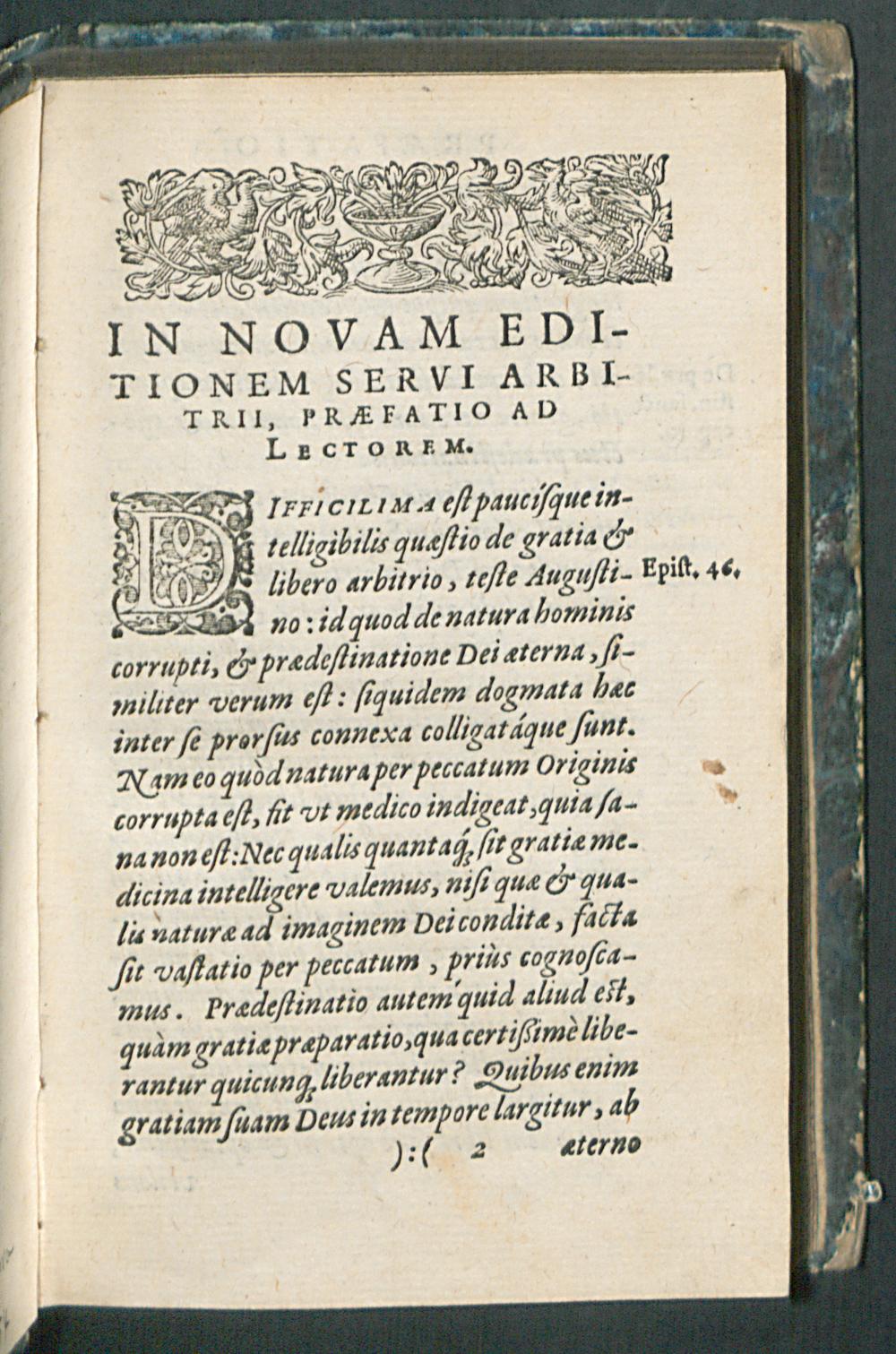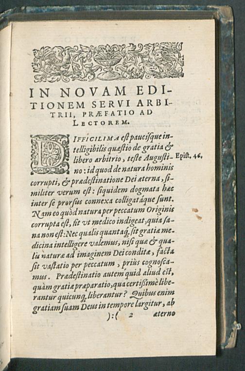 DE SERVO ARBI-||TRIO || MARTINI || LVTHERI, AD D.|| ERASMVM ROTE-||RODAMVM,|| Liber illustris:|| DESIDERATIS IAM PRI-||DEM EXEMPLARIBVS, CON-||tra veteres et nouos Pelagianos, in vsum studiosae || iuuentutis, & propagandae verita-||tis ergò;|| Nunc denuò, cum praefatione ad Lectorem,|| editus.|| [v. (Iacobus Kimedoncius D.||)]
