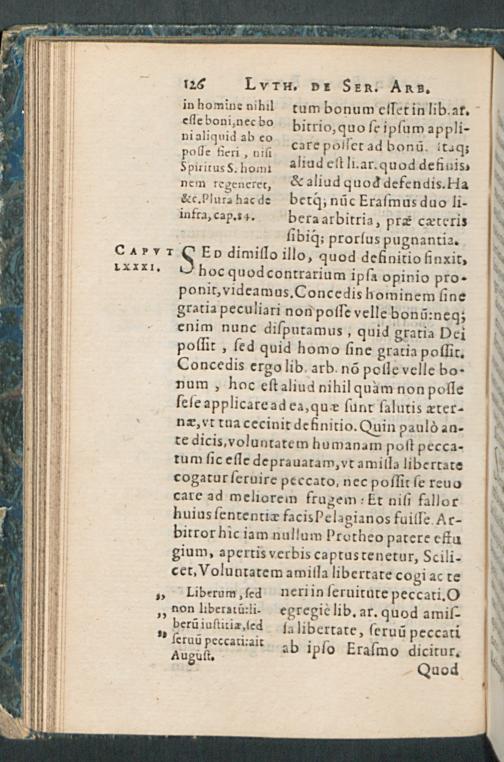 DE SERVO ARBI-||TRIO || MARTINI || LVTHERI, AD D.|| ERASMVM ROTE-||RODAMVM,|| Liber illustris:|| DESIDERATIS IAM PRI-||DEM EXEMPLARIBVS, CON-||tra veteres et nouos Pelagianos, in vsum studiosae || iuuentutis, & propagandae verita-||tis ergò;|| Nunc denuò, cum praefatione ad Lectorem,|| editus.|| [v. (Iacobus Kimedoncius D.||)]