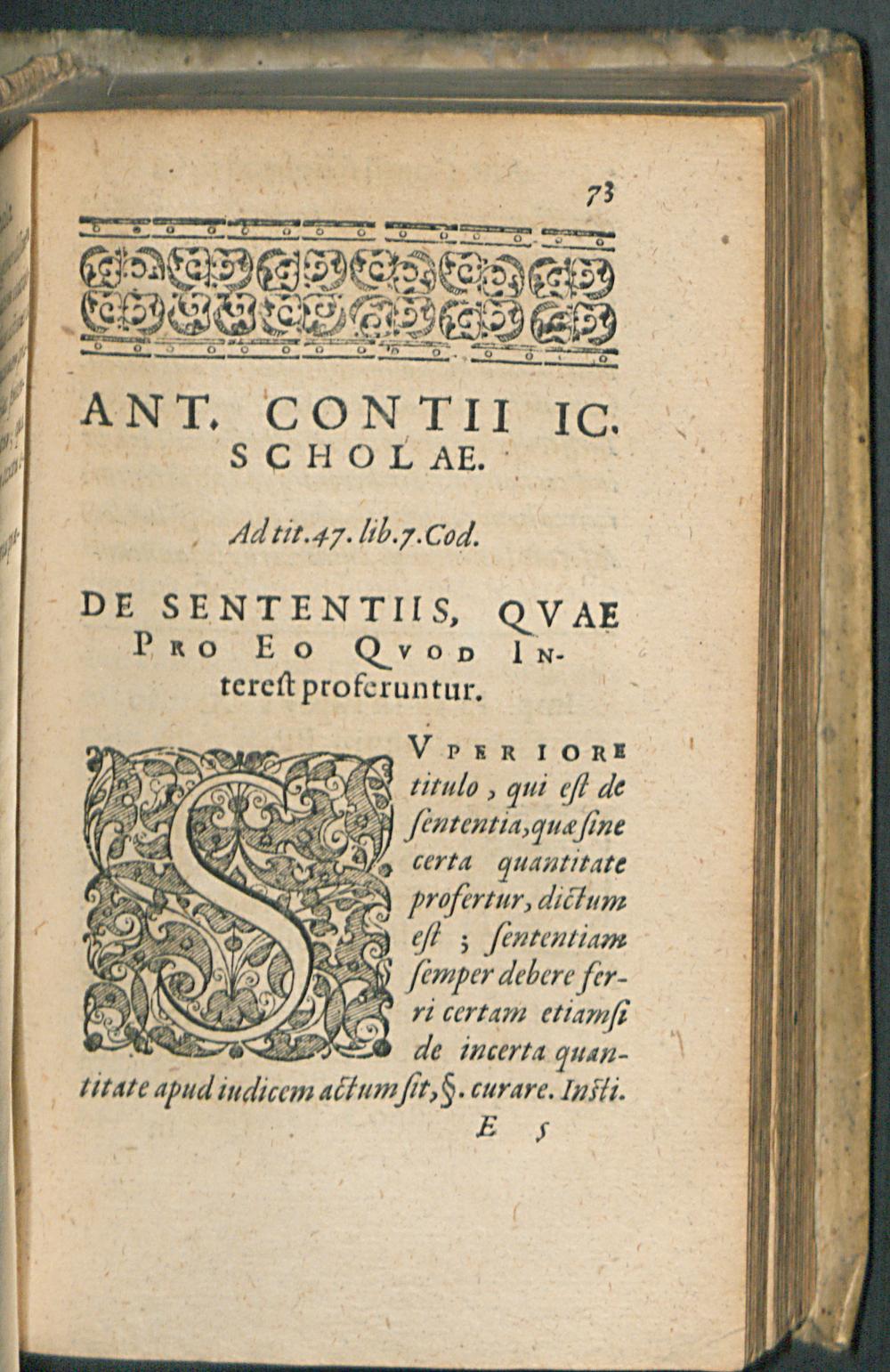 SCHOLAE || ANT. CONTII || IC. CELEBERRIMI:|| AD VIII. TITVLOS LI-||BRI VII. CODICIS MA-||teriam praescriptionum || continentes.|| QVIBVS EIVSDEM COMMEN-||tarius ad l. vnicam C. de sententiis ... || Itemq[ue] tractatus || ANTONII FVMEI I.C.|| de eo quod interest,|| acceßit.||