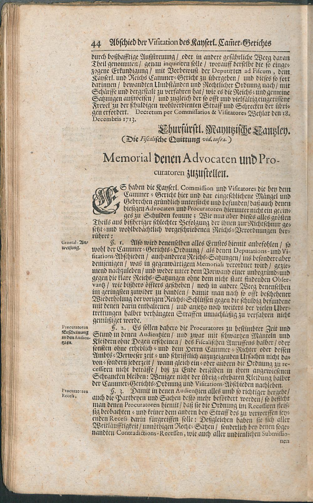 Visitations-Abschied Und Memorialien, Vom Jahr 1713 / [Kayserl. Cam[m]er-Gericht]