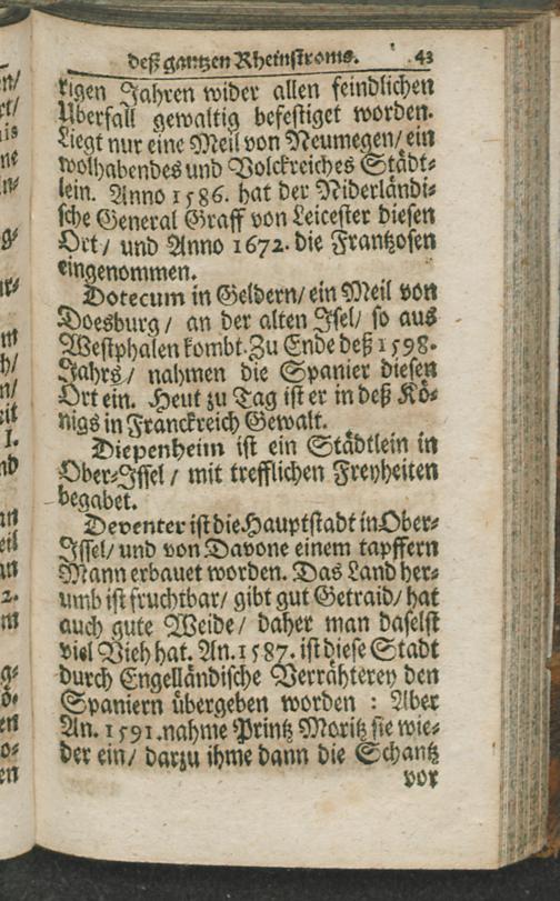 Totius Fluminis Rheni Accuratissima descriptio Das ist: Grundrichtige Beschreibung und Beschaffenheit aller Städte/ Schlösser und Vestungen/ so hin und wieder am gantzen Rheinstrom gelegen : Unter wessen Gebiet sie gehören/ und was sich notables mit ihnen/ so wol ehedessen/ als vor kurtzverwichner Zeit zugetragen / Mit grosser Mühe auf das kürtzeste also eingerichtet/ nach dem Alphabet vorgestellet Und mit einer Landkarte ... gezieret Von Christian Ernst Nigrino