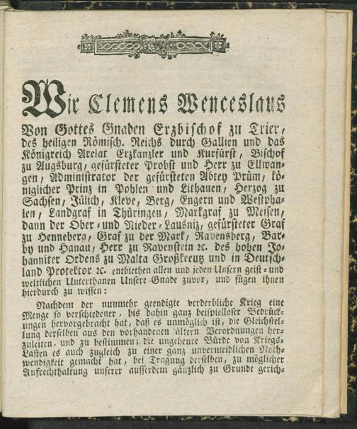 Verordnung die Gleichstellung der Beiträge aller Stände zu den vorgewesenen Kriegslasten betreffend : vom 22ten Julius 1802 / [Clemens Wenceslaus Kurfürst]