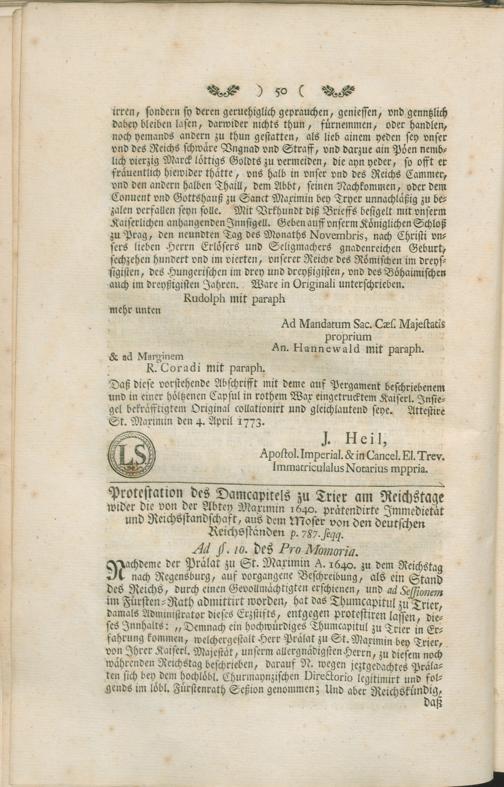 An Eine Höchstansehnliche Kaiserliche Commission, und Hochverordnete Reichs-Visitations-Deputation, Unterthänigste Vorstellung und Bitte Anwalds Seiner Churfürstlichen Durchlaucht zu Trier : die von der Abtey St. Maximin prätendirende Immedietät und Reichsstandschaft wegen des zum Erzstift Trier gehörigen Burggrafthums Freudenberg und die darauf seit kurzem übernommene Kammerzieler betreffend / D. F. Haas