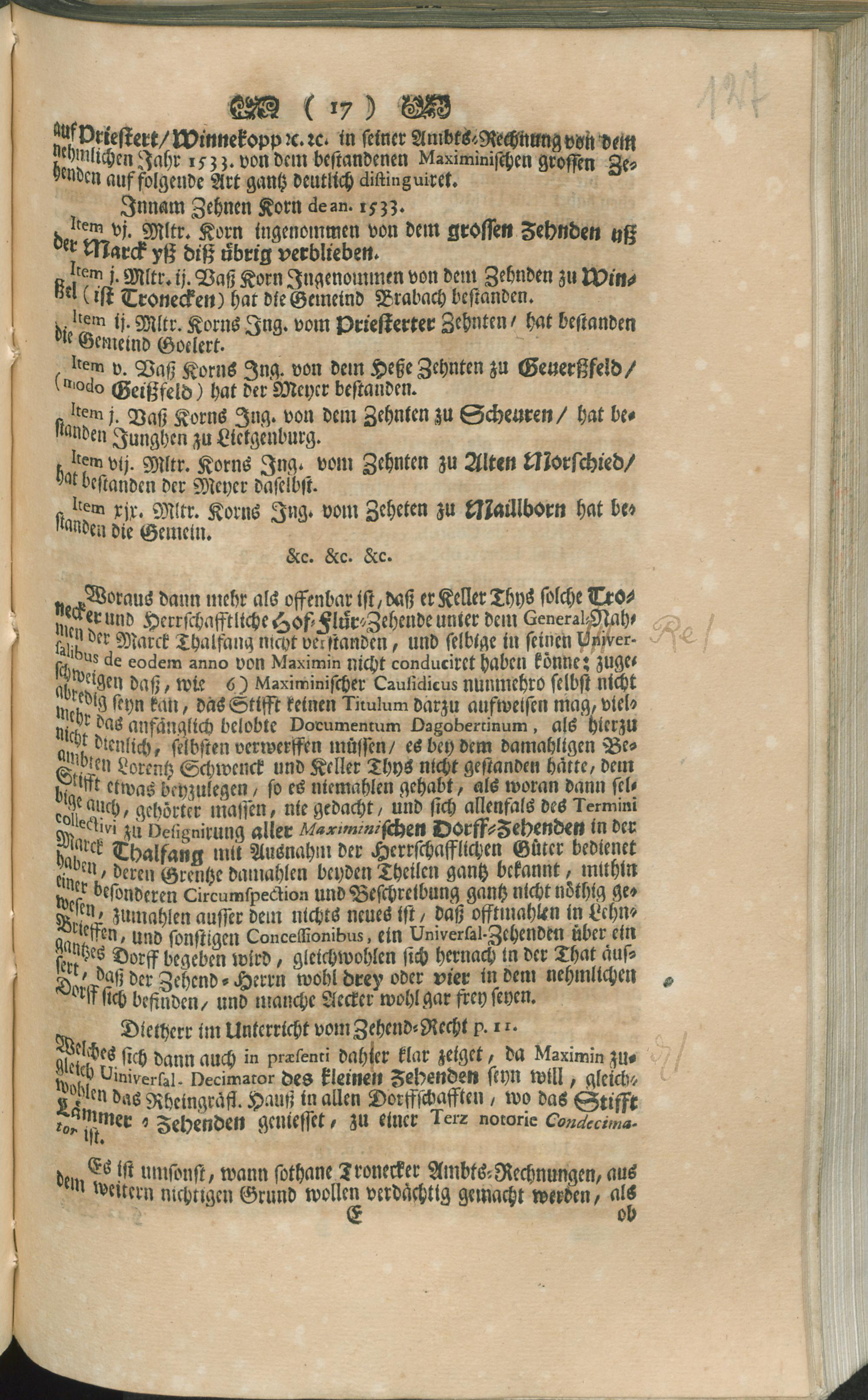 Acten-mäßige Geschichts-Erzehlung/ samt rechts-begründetem Beweiß/ daß der groß und kleine Zehende zu Tronecken/ und der von den herrschafftlichen eigenthumlichen Hof-Gütern/ in der Marck Thalfang Tronecker Ambts/ der Rheingräfl. Landes-Herrschafft von vielen Seculis her/ und nach Maximinischen ehemahligen/ sowohl Judicial- als Extra-Judicial-Bekanntnissen/ pleno jure zustehe/ und von selbiger biß diese Stunde also genossen worden ... Ad Causam Herrn Abts und Convents des Stiffts St. Maximin bey Trier/ contra Weyl. Herrn Rhein-Graf Otto zu Kyrburg/ modo Herrn Rhein-Graf zu Grumbach/ und übrige Rheingräfliche Herren Agnaten. Decis mandati poenalis C. C. ...