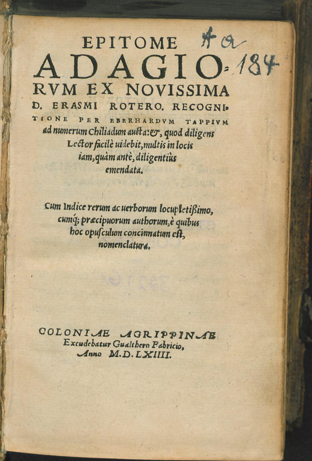EPITOME || ADAGIO=||RVM EX NOVISSIMA || D. ERASMI ROTERO. RECOGNI=||TIONE PER EBERHARDVM TAPPIVM || ad numerum Chiliadum aucta ... || multis in locis || ... emendata.|| Cum Indice rerum ac uerborum locupletißimo.|| ... ||