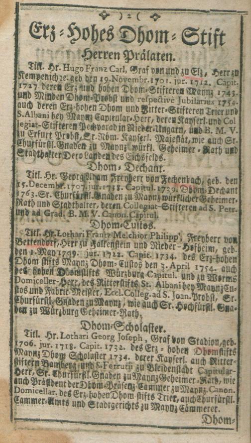 Chur-Maynzischer Hof-, Staats- und Stands-Calender : auf das Jahr nach unsers Herrn und Heilands Jesu Christi gnadenreichen Geburt ...