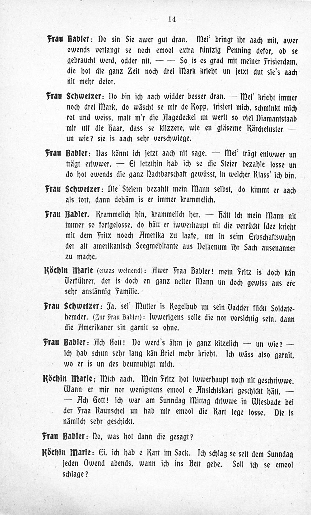 Babbel nit! Oder: Was kitzelt's mich an de Füss! : Mainzer Karnevalsposse ; lustige Volksbilder mit Gesang und Ballett in fünf Akten ; aufgeführt am Mainzer Stadt-Theater vor und zu Fastnacht 1909 / von Jean Dremmel