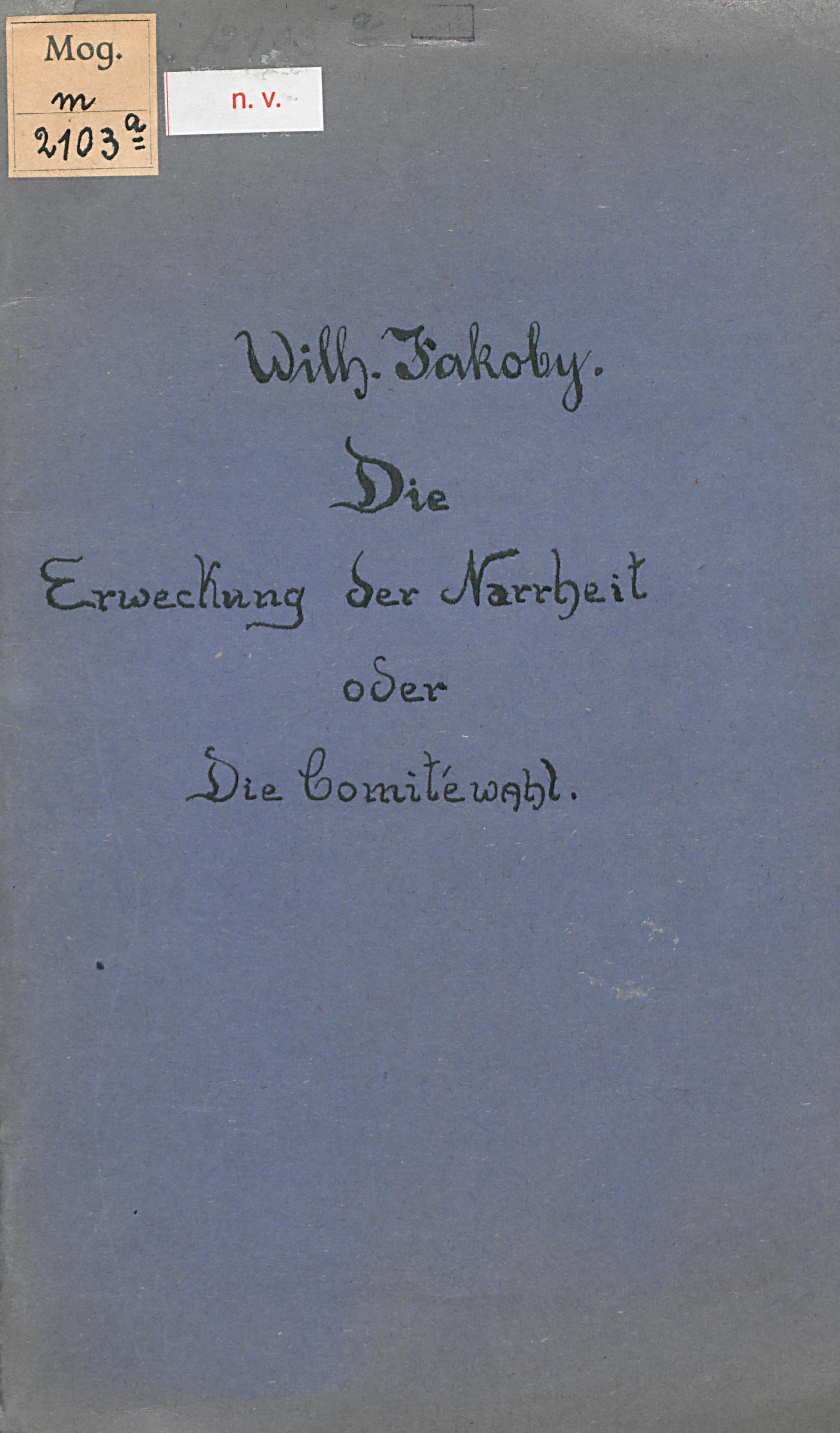 Die Erweckung der Narrheit oder Die Comitéwahl : realistisch-idealistisch-natürlich-phantastisches Fastnachtsspiel mit Gesang und Tanz / von Wilhelm Jakoby