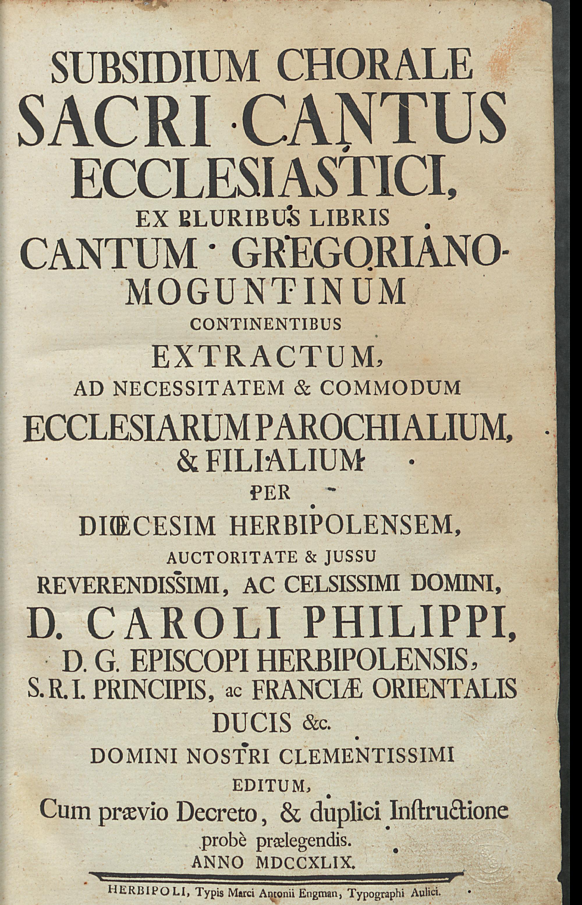 Subsidium Chorale Sacri Cantus Ecclesiastici : Ex Pluribus Libris Cantum Gregoriano-Moguntinum Continentibus Extractum : Ad Necessitatem & Commodum Ecclesiarum Parochialium, & Filialium Per Diœcesim Herbipolensem, Auctoritate & Jussu Reverendissimi, Ac Celisissimi Domini, D. Caroli Philippi, D.G. Episcopi Herbipolensis, S.R.I. Principis, ac Franciæ Orientalis Ducis &c. Domini Nostri Clementissimi Editum, Cum prævio Decreto, & duplici Instructione probè prælegendis