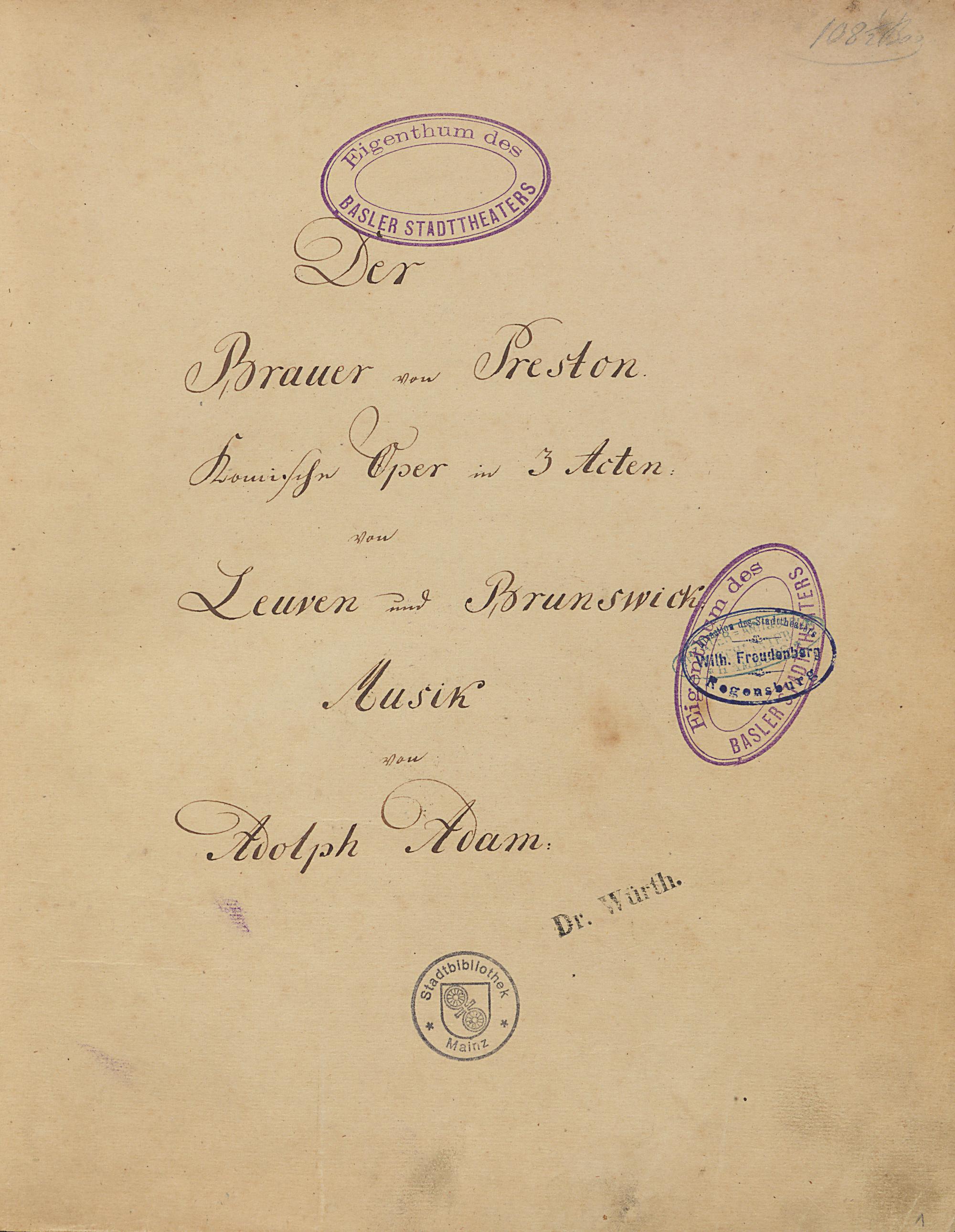 Der Brauer von Preston. Komische Oper in 3 Acten. von Leuven und Brunswick. Musik von Adolph Adam - StB Mainz, Hs III 80
