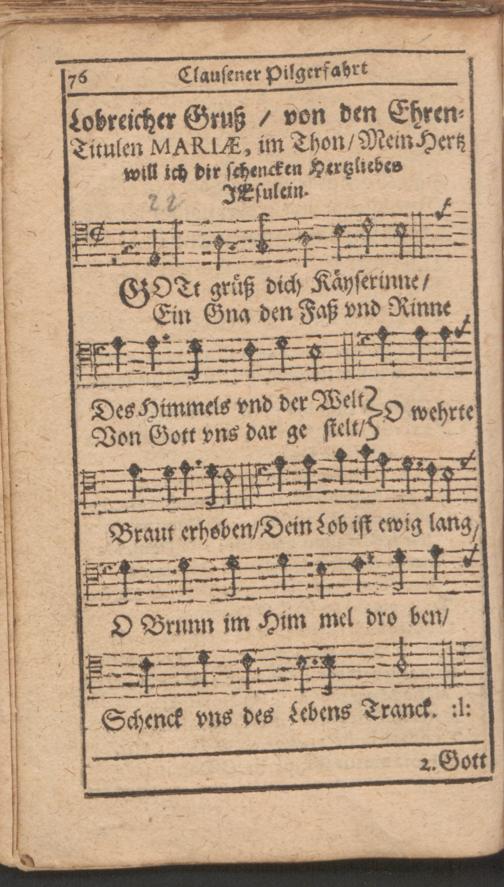Außerlesenes Bett- Betracht und Gesang Buchlein von den sieben farnembsten Schmertzen Mariae Matris Dolorosae : in allen Processionen durchs Jahr, fürnemblich aber auff der Pilgerfahrt nacher Eberhards Clausen zu unser L. Frawen Miraculoser H. Capeln gar nützlich zu gebrauchen ; gezieret mit viel anderen New- und Uhralten uber auss schönen Melodeyen und Catholischen Kirch-Gesängen etc