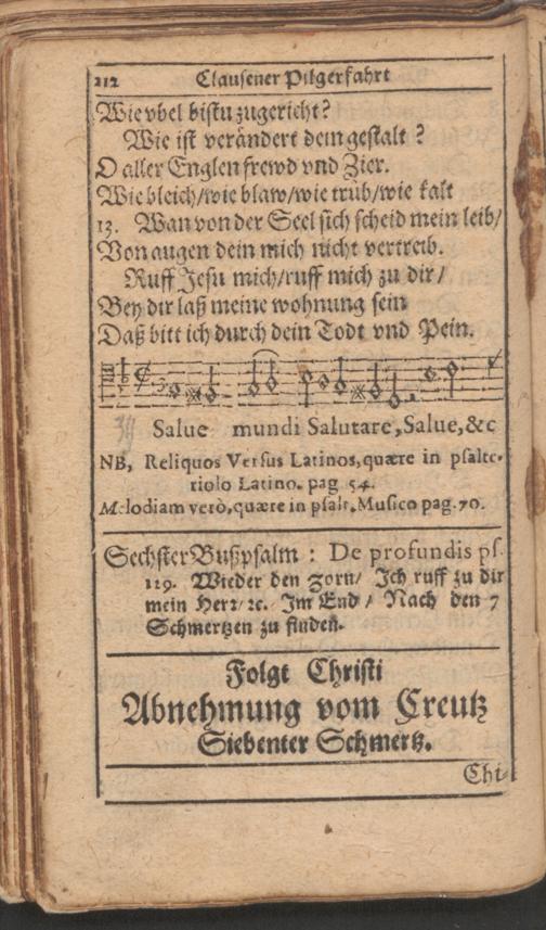 Außerlesenes Bett- Betracht und Gesang Buchlein von den sieben farnembsten Schmertzen Mariae Matris Dolorosae : in allen Processionen durchs Jahr, fürnemblich aber auff der Pilgerfahrt nacher Eberhards Clausen zu unser L. Frawen Miraculoser H. Capeln gar nützlich zu gebrauchen ; gezieret mit viel anderen New- und Uhralten uber auss schönen Melodeyen und Catholischen Kirch-Gesängen etc