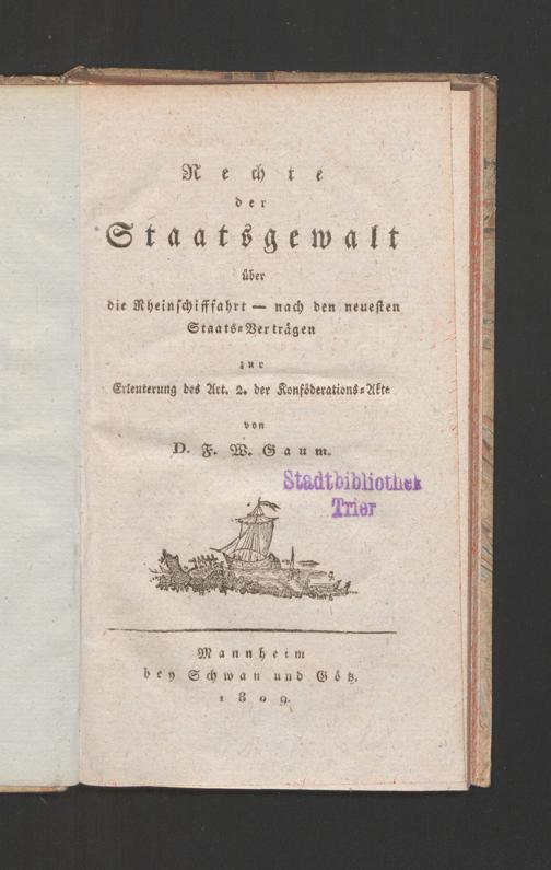 Rechte der Staatsgewalt über die Rheinschifffahrt : nach den neuesten Staats-Verträgen zur Erleuterung des Art. 2 der Konföderations-Akte / von D. F. W. Gaum