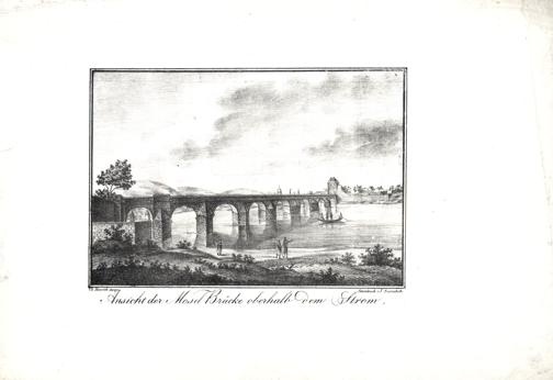 Ansicht der Mosel Brücke oberhalb dem Strom / Steindruck v. J. Susenbeth