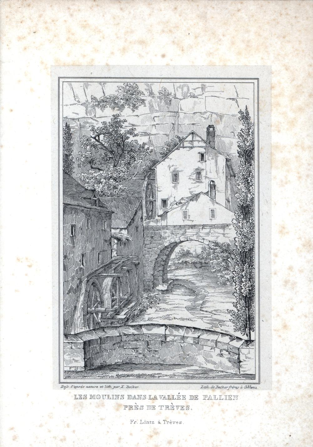 [Teilansicht von Trier - Pallien mit den beiden Mühlen] : les moulins dans la vallée de Pallien près de Trèves / dess. d'après nature et lith. par X. Becker. Lith. de Becker frères a Coblenz