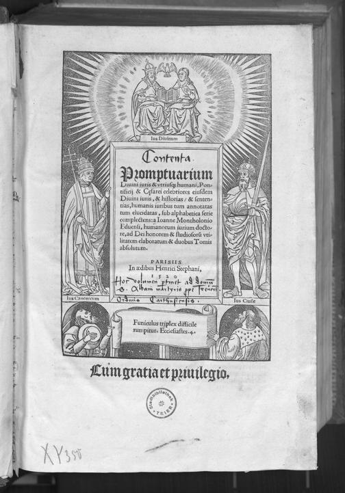 Promptuarium divini iuris & utriusque humani, pontificii & c[a]esarei celebriores eiusdem divini iuris, & historias, & sententias, humanis iuribus tum annotatas tum elucidatas, sub alphabetica serie complectens / a Ioanne Montholonio ... elaboratum et duobus tomis absolutum