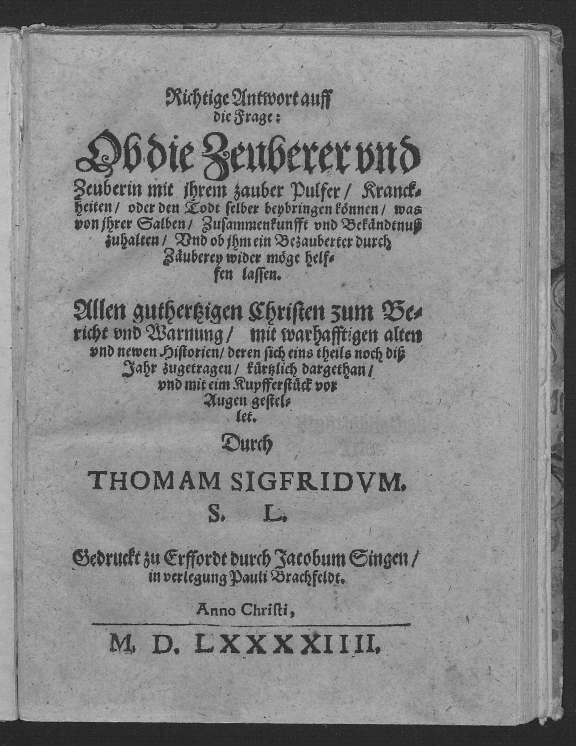Richtige Antwort auff die Frage: Ob die Zeuberer und Zeuberin mit ihrem Zauber-Pulfer Kranckheiten oder den Todt selber beybringen können, was von ihren Salben, Zusammenkunfft und Bekändtnuß zu halten ... / Thomas Sigfrid