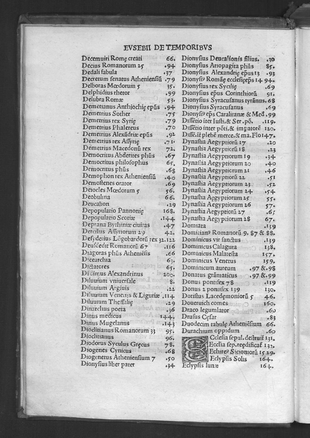 Evsebii Caesarie[n]sis Episcopi Chronico[n] / quod Hieronymus presbyter diuino eius ingenio Latinum facere curauit & vsq[ue] in Vale[n]te[m] Caesarem Romano adiecit eloquio. Ad que[m] & Prosper & Matthaeus Palmerius & Matthias Palmerius co[m]plures addidere, quibus demum nonnulla ad haec vsq[ue] tempora subsecuta adiecta sunt