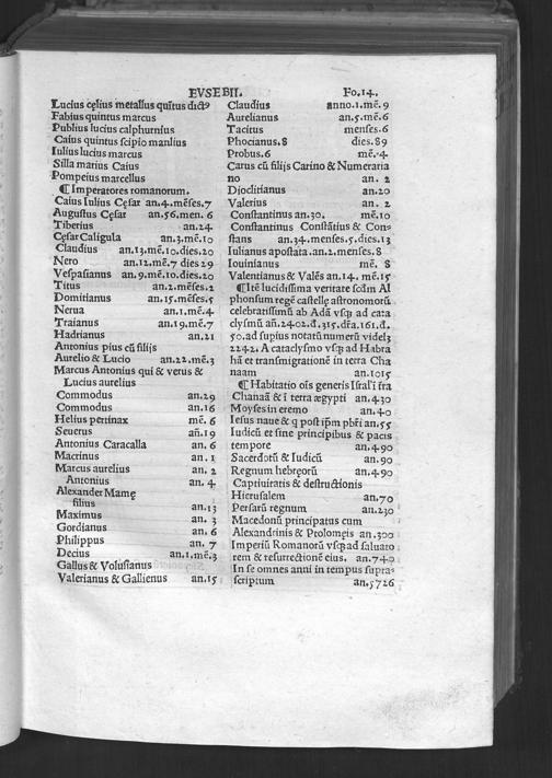 Evsebii Caesarie[n]sis Episcopi Chronico[n] / quod Hieronymus presbyter diuino eius ingenio Latinum facere curauit & vsq[ue] in Vale[n]te[m] Caesarem Romano adiecit eloquio. Ad que[m] & Prosper & Matthaeus Palmerius & Matthias Palmerius co[m]plures addidere, quibus demum nonnulla ad haec vsq[ue] tempora subsecuta adiecta sunt
