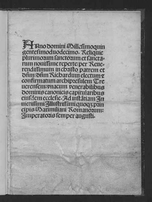 Anno d[omi]ni M.CCCCC.XIJ. Reliquie plu//rimoru[m] s[an]ctoru[m] & s[an]ctar[um] nouissime rep[er]te : Ad instantiam inui-//ctissimi Jllustrissimi quoq[ue] principis Maximiliani Romanoru[m]// Jmperatoris semper augusti / p[er] reuerendissimu[m] in ch[rist]o patre[m] & d[omi]n[u]m// d[omi]n[u]m Richardu[m] electu[m] et [con]firmatu[m]// Archipresulem Treuerensem: vna cum venerabilibus dominis// Canonicis capitularibus eiusdem ecclesie