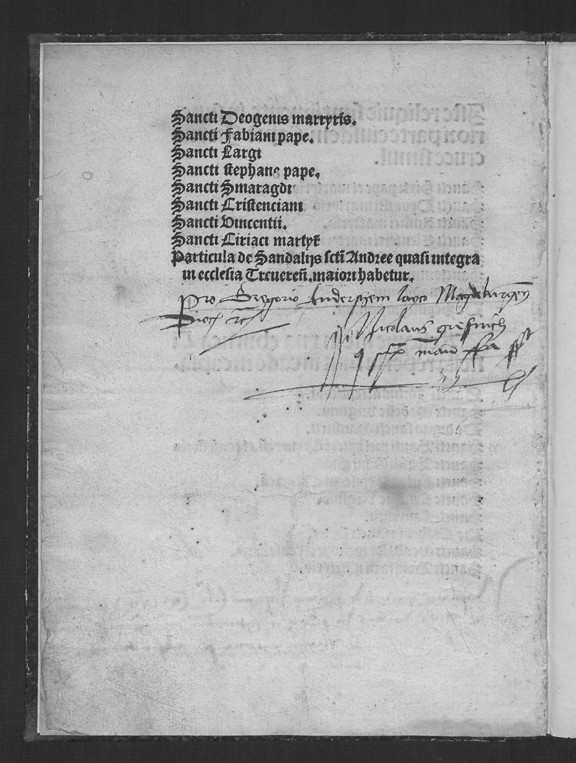 Anno d[omi]ni M.CCCCC.XIJ. Reliquie plu//rimoru[m] s[an]ctoru[m] & s[an]ctar[um] nouissime rep[er]te : Ad instantiam inui-//ctissimi Jllustrissimi quoq[ue] principis Maximiliani Romanoru[m]// Jmperatoris semper augusti / p[er] reuerendissimu[m] in ch[rist]o patre[m] & d[omi]n[u]m// d[omi]n[u]m Richardu[m] electu[m] et [con]firmatu[m]// Archipresulem Treuerensem: vna cum venerabilibus dominis// Canonicis capitularibus eiusdem ecclesie